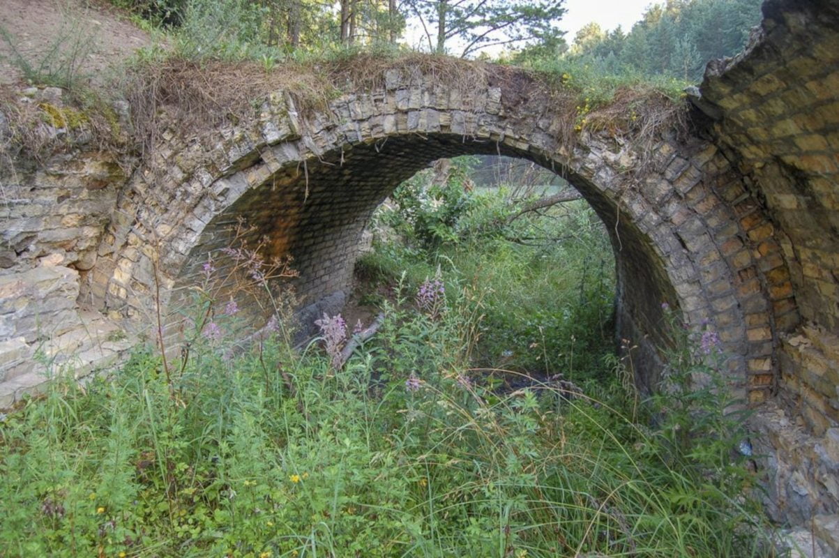 Sparninio tipo akmeninė pralaida (tokio tipo statiniai projektuose vadinami akmeniniais vamzdžiais) buvo pastatyta 18 sieksnių (38.34 m) ilgio, 1.5 sieksnio (3,26 m) pločio ir 2.34 sieksnio (5 m) aukščio. Portalai apdailinti tašytais stačiakampiais akmenų blokais. Pusapskritės arkos skliautas – iš geltonų molinių plytų. Pylimo aukštis , nuo savarinio akmens viršaus 7 m, nuo upelio lygio 12 m.