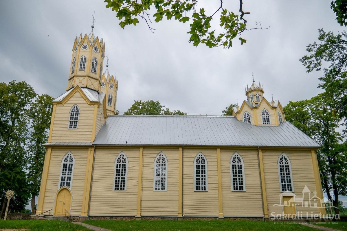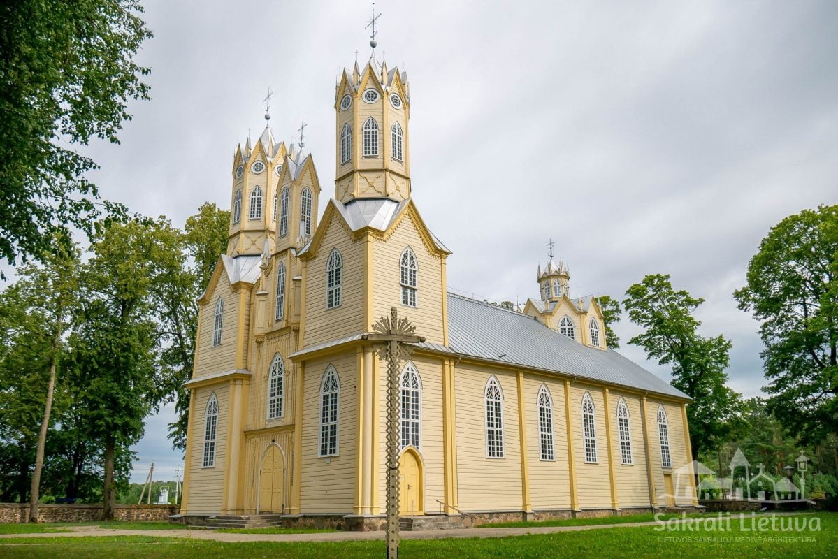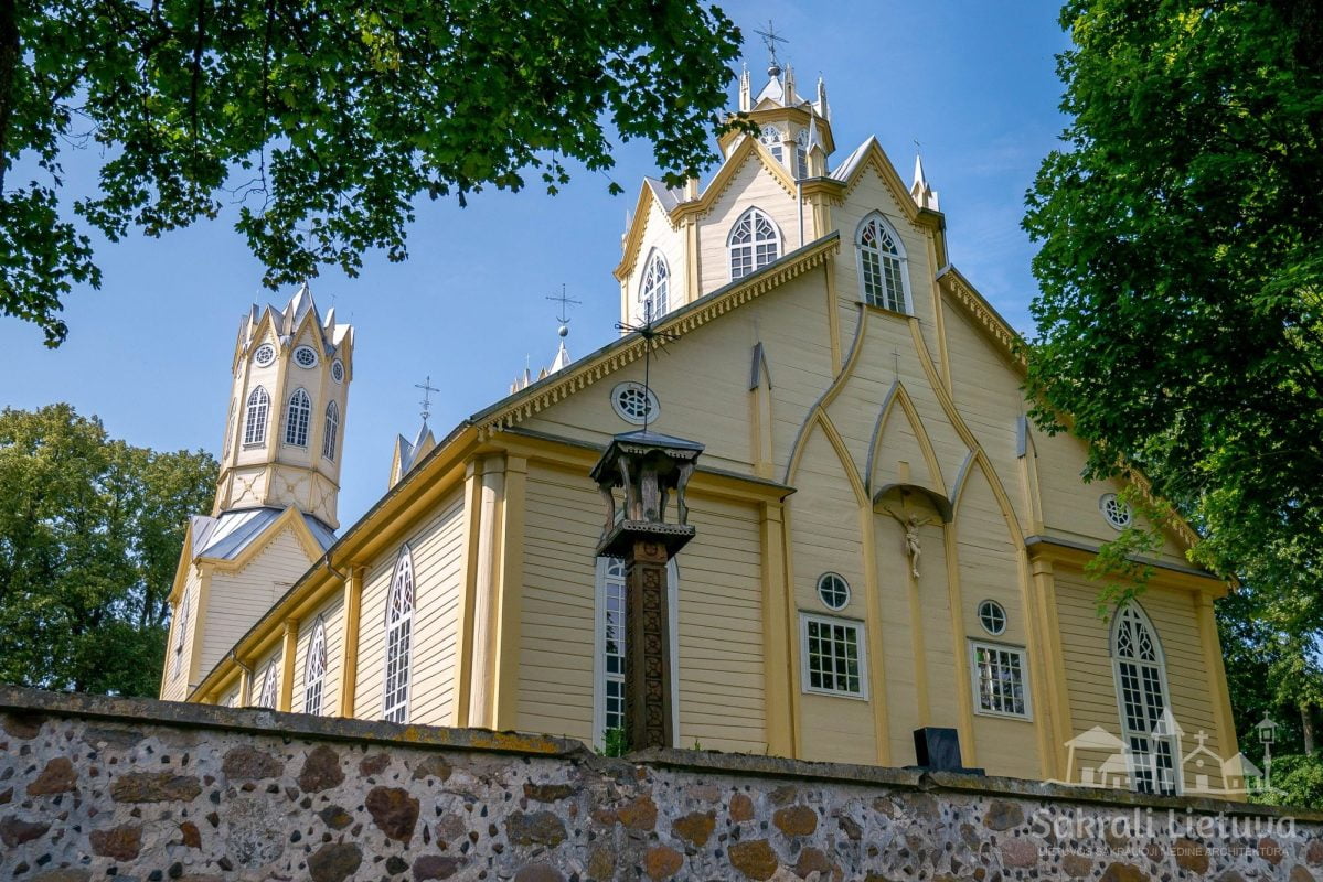 Tai viena iš nedaugelio Lietuvos medinių bažnyčių, turinti neogotikos bruožų. Jos statytojai bandė imituoti gotikinės Vilniaus Šv. Onos bažnyčios formas. Neogotikines formas taip pat papildo neobaroko ir klasicizmo elementai. Bažnyčia simetriška, stačiakampio plano, su vienoje presbiterijos pusėje esančia koplyčia, kitoje – zakristija. Pastatas su dviem aštuonkampio pagrindo bokštais pagrindiame fasade, kupolu virš presbiterijos, keturbriauniu centriniu bokšteliu ir pinakliais, gausiai puoštas kitais eksterjero dekoro elementais: ornamentuotais kryžiais ant bokštų ir smailių, mediniais dekoratyviais apdailos elementais, smulkiu langų ir švieslangių skaidymu. Fasaduose didingumo įspūdį sudaro medžio apdaila, imituojanti masverkus, pinaklius, rozetes ir kitus gotikinei mūrinei architektūrai būdingus puošybos elementus. Galiniame fasade įkomponuota nukryžiuotojo skulptūra.