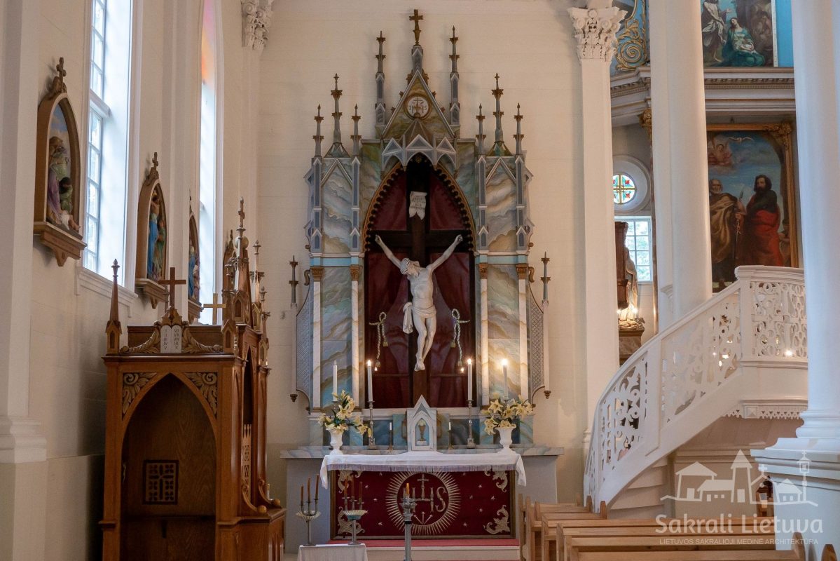 Vidinė bažnyčios erdvė yra suskaidyta į tris navas eilėmis suporintų kolonų su itin puošniais korintiniais orderiais. Bažnyčioje yra išlikę neogotikiniai altoriai, vertingi K. Rafalavičiaus ir N. Silvanavičiaus tapybos kūriniai, autentiška sakykla, klausyklos, sietynai, amžinos ugnies lempa.