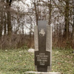 žymi stilizuoto kryžiaus formos juodo akmens paminklas, plevėsuoja iškelta Lietuvos