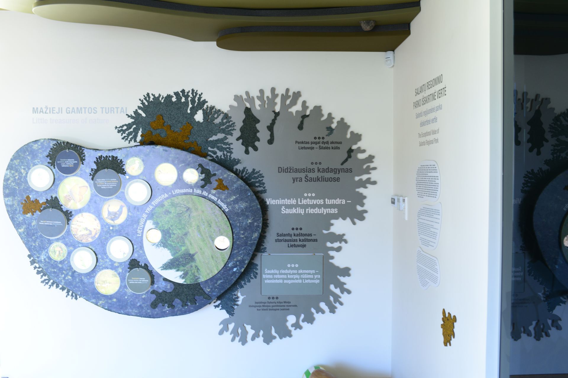 Lankytojas supažindinamas ne tik su šio krašto gamta, bet ir su kultūra. Čia galima "gyvai" išgirsti žemaičių tarmę, daugiau sužinoti apie tradicinę architektūrą, archeologijos paveldą. Lankytojai turi galimybę interaktyviame žaidime patys suformuoti šio regiono kraštovaizdį, pamatyti, kokiais gamtos turtais didžiuojasi Salantų regioninis parkas, susipažinti su svarbiausiu elementu - rieduliais bei išbandyti jėgas mėgindami "suspausti" akmenį.