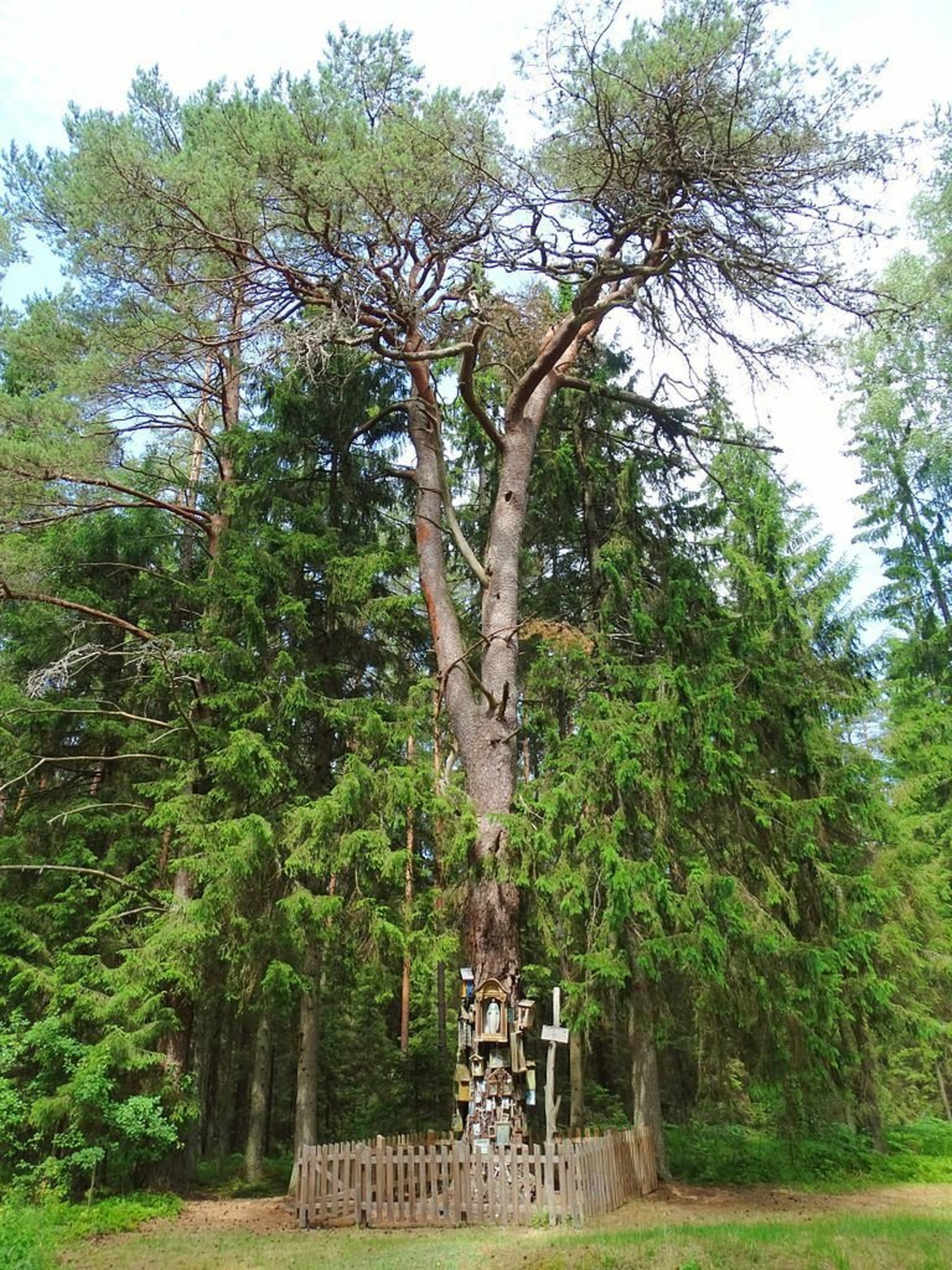 Kamieno apimtis siekia 3,2 m, aukštis – 16 m. Vieta, kurioje auga pušis, nuo seno laikoma šventa.Legenda pasakoja apie prieš daug metų stebuklingai praregėjusį akląjį, vardu Martynas, kurio negalią išgydė šio medžio žievė. Apie tai sužinojęs klebonas ir medį pašventinęs. Nuo to laiko aplankyti pušies atvykstantys žmonės aplink kamieną kabina įvairius šventųjų atvaizdus ir kryželius, o pušis vadinama šio žmogaus vardu. Vyresni aplinkinių kaimų gyventojai mena, jog prie pušies žmonės ateidavo pasimelsti susirgus šeimos nariams, jaunimas lankydavosi prieš vestuves, prašydavo medžio palaiminimo. Ant pušies kamieno prikalta koplytėlė su šv. Martyno atvaizdu. Žemiau koplytėlės prikalti stacijų vaizdeliai.